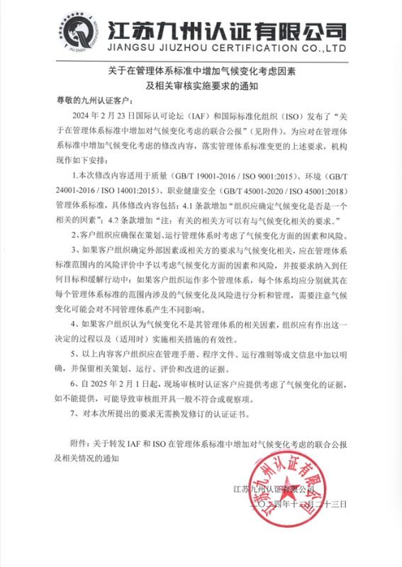 附件:關于轉發(fā)IAF和ISO在管理體系標準中增加對氣候變化考慮的聯合公報及相關情況的通知